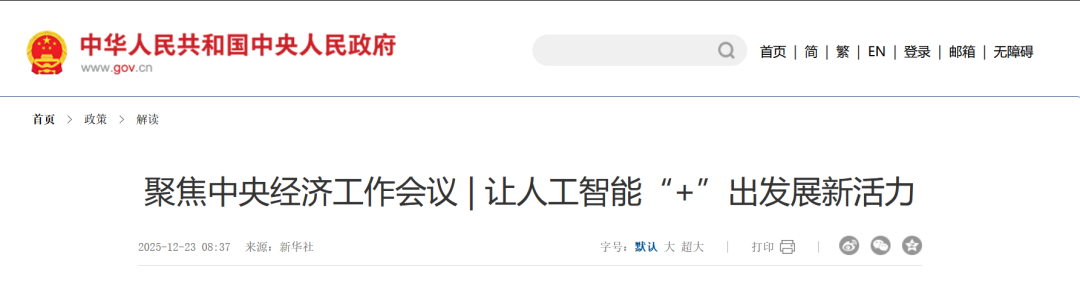 日前召开的中央经济工作会议将“深化拓展‘人工智能+’”列为明年重点任务,这与“十五五”规划建议中“全面实施‘人工智能+’行动”相呼应,标志着人工智能发展进入系统升级新阶段。会议明确人工智能是连接创新链与产业链、培育新质生产力的关键桥梁,其与产业发展、民生保障、社会治理的深度融合将全方位赋能千行百业。与此同时,会议同步强调“完善人工智能治理”,旨在通过健全法律法规、应用规范与伦理准则,为技术创新的“放活”与风险防范的“善治”提供稳压器和安全网,确保人工智能健康有序发展,特别是在医疗健康等高风险、高关切的领域实现可信可控的应用。